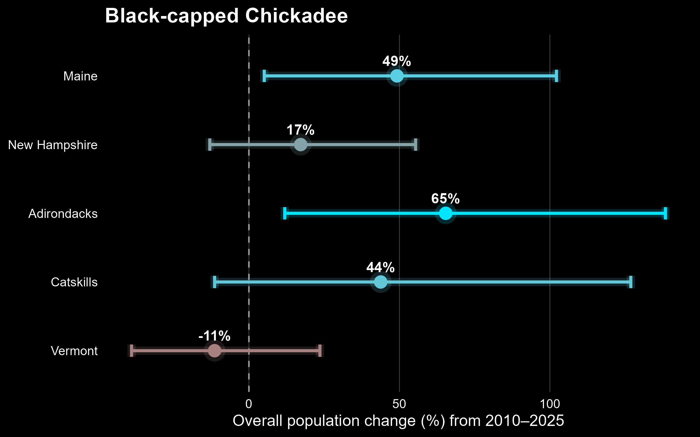 Black-capped Chickadee population changes, with 95% credible intervals, as based on Mountain Birdwatch monitoring data within each region from 2010-2025.